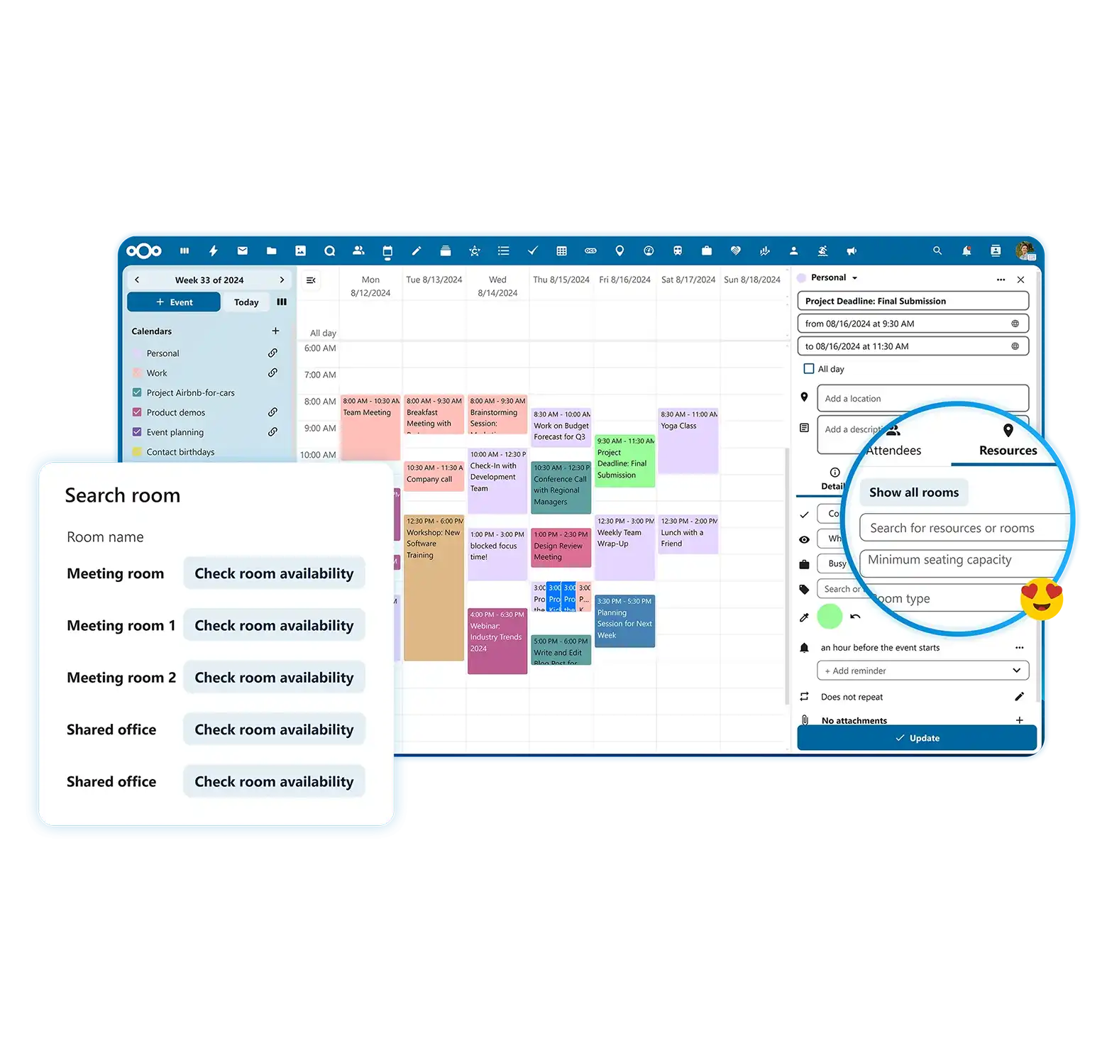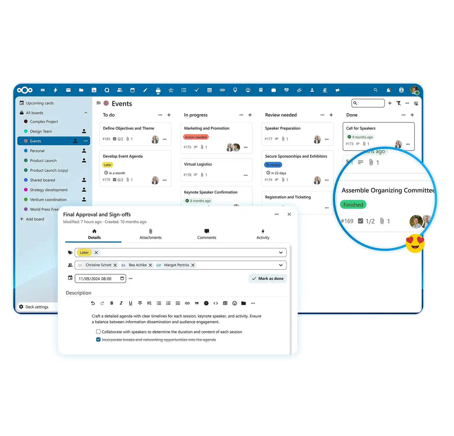 Maak persoonlijke en gedeelde agenda’s aan die automatisch synchroniseren tussen apparaten. Je plant eenvoudig vergaderingen, deelt beschikbaarheid en voorkomt dubbelboekingen, allemaal binnen je eigen beveiligde cloud.